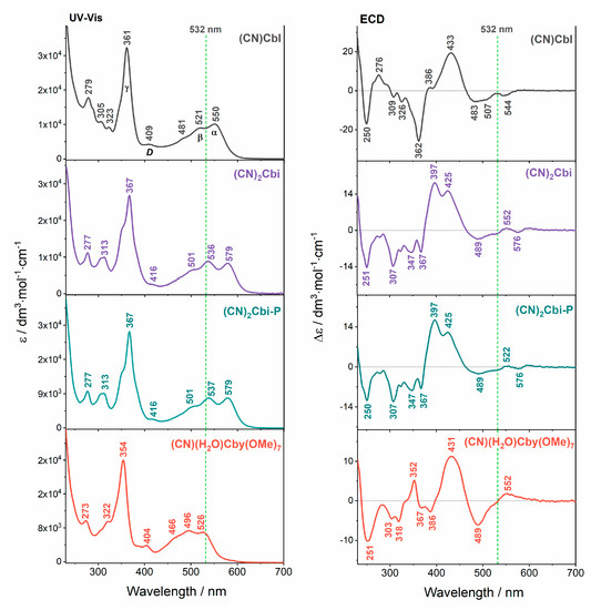 The UV-Vis and ECD spectra of vitamin B12 in an aqueous solution are presented, along with spectra of its truncated derivatives in Figure 2 and Figure S1 (Supplementary Materials). The absorption spectra of (CN)Cbl [40] and some of its incomplete analogs in organic and non-organic solvents [18,37,48,49] have been previously reported and they agree well with the spectra obtained in this study. The spectral profiles and electronic properties of corrinoid molecules slightly change depending on the solvent used [36,48]. As generally proposed and subsequently confirmed, the UV-Vis spectra are mostly dominated by intense corrin-based π→π* transitions, since (CN)Cbl and its derivatives closely resemble those possessing metal-free corrin rings [40,50].