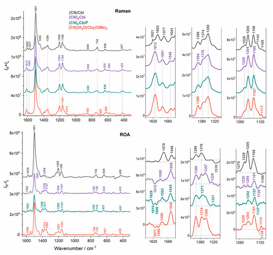 Detailed comparison of Raman and ROA spectra of vitamin B12 and its truncated analogs in the 900 to 350 cm−1 spectral region.