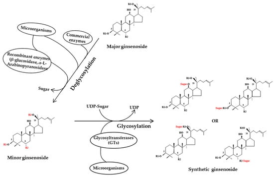 - Hu, Y.; Li, H.; Qu, Y.; Zhang, X.; Zhang, J.; Dai, L. Biocatalytic synthesis of a novel bioactive ginsenoside using UDP-glycosyltransferase from Bacillus Subtilis 168. Catalysts 2020, 10, 289. [Google Scholar] [CrossRef]