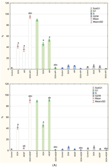 (A) Cell cycle analysis by image cytometry. The cells were treated for 48 h with 1 µM of doxorubicin (DOX) and 50 μM of apigenin (API)/50 μM of hesperidin or combined (DOX + API, DOX + HESP). The values obtained from 3 independent experiments were presented as mean ± SD. (B) Histograms representative of all repetitions of the experiment (M1—subG1, M2—G1, M3—S, M4—G2/M phase).
