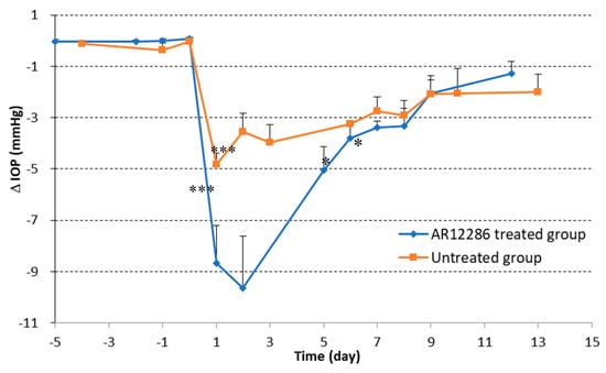 The control group exhibited IOP reduction of 3 to 5 mmHg prior to Day 8; however, the group treated with AR12286 exhibited reduction in IOP of 5 to 10 mmHg prior to Day 5, and a similar reduction relative to the control after Day 5.