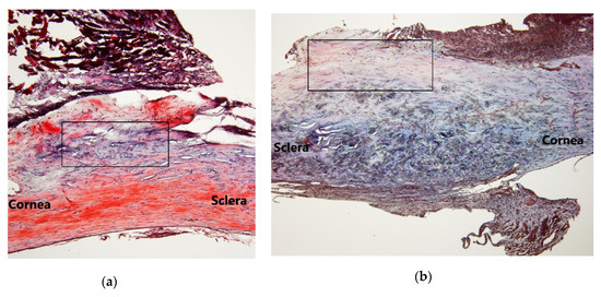 Episcleral tissue at the site of the trabeculectomies was trimmed and grounded for histological analysis eight days after surgery. The eyeballs were enucleated, fixed in 10% neutral buffered formalin solution for 24 h, dissected at the equator, and embedded in paraffin. Anterior segments of the eyes containing the cornea, sclera, and conjunctiva were first cut at a sagittal orientation at 5 μm thickness, mounted on subbed slides, and dried. The sections were dewaxed in xylene, rehydrated in alcohol, and stained with hematoxylin, eosin, and Masson’s trichrome stain.