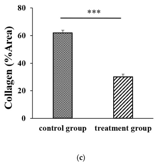 Fibrotic effects of AR12286 on post-trabeculectomy bleb tissue. Histological examination of bleb tissue from (a) control group (without AR12286) and (b) treatment group (injected with AR12286) of experimental rabbit trabeculectomy models. Collagen deposition (blue) examined using Masson’s trichrome stain (a). On Day 8 post-surgery, less intense blue stain was evident in the bleb tissue compared with that in the control group, indicating that AR12286 reduced collagen deposition in bleb tissue. (c) Ratios of collagen-fiber areas to conjunctival and scleral lesions in control and treated eyes. Values represented as means ± SEM (n = 6). *** indicates p < 0.001 compared with controlled eyes.