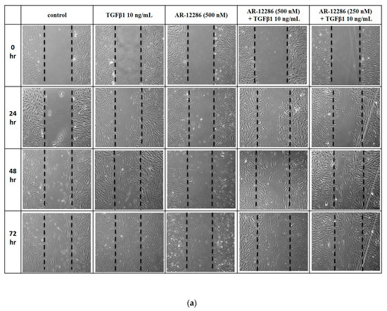 After 24 h, HConF migration induced by TGF-β1 was 10-fold higher than that of the control. This migration was not inhibited by 250 and 500 nM of AR12286. However, at 48 and 72 h, cell migration of HConFs induced by TGF-β1 was inhibited by both 250 (p < 0.01) and 500 nM (p < 0.01) concentrations of AR12286.