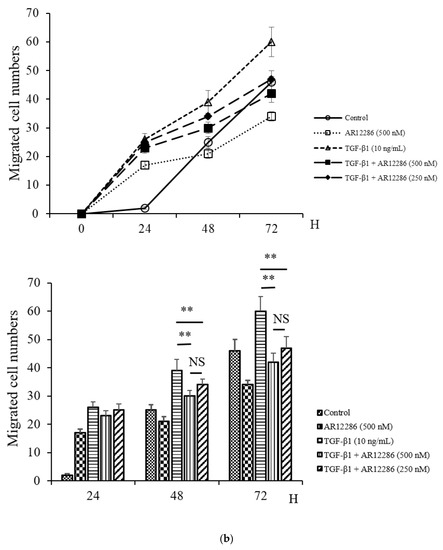 Cell migration inhibited by AR12286. Cell-free linear wound presented when confluent cultures were scraped with a pipette tip. Medium was individually replaced with fresh cultured medium in the following cultures: control, TGF-β1-induced, AR12286-treated, TGF-β1-induced with 250 nM treatment of AR12286, and TGF-β1-induced with 500 nM treatment of AR12286. (a) Cell migration into the wound area photographed after incubation for 24, 48, and 72 h; (b) number of migrated cells was determined. Dotted lines, edges of migrated cells. All data expressed as means ± SEM (n = 6). Asterisks indicate significantly different responses (**, p < 0.01), and NS signifies no significant difference.