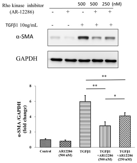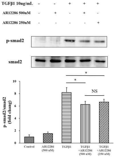 For Western blot analysis, cells were treated with 10 ng/mL TGF-β1 (Pepro Tech, New York, NY, USA) for 24 h in the absence and presence of AR12286 at 250 or 500 nM. The treated and untreated cells were washed with PBS, harvested by scraping, and centrifuged at 1000× g. Cell pellets were resuspended and sonicated in a cold lysis buffer (EDTA-free PROPREPTM Protein Extraction Solution; iNtRON Biotechnology, Inc., Seoul, Korea). Lysates were then centrifuged for 10 min at 12,000× g, and protein concentration in the clear supernatant was determined using the BCA protein assay kit (Pierce, Rockford, IL, USA). Lysates (20 μg) were resolved by 10% SDS-PAGE and transferred to PVDF membranes. Membranes were blocked with 5% (w/v) milk for 1 h at room temperature and incubated for 1 h at room temperature with 1:1000 dilutions of antibodies against GAPDH (Millipore, Rockland, NY, USA), α-SMA (Sigma-Aldrich), SMAD2, and phosphorylated SMAD2 antibodies (Cell Signaling Technology, Danvers, MA, USA). Membranes were washed and incubated with horseradish peroxidase-conjugated secondary antibodies (1:1000; Jackson ImmunoResearch Laboratories, West Grove, PA, USA) for 1 h at room temperature, and proteins were visualized using an enhanced chemiluminescence procedure (enhanced chemiluminescence reagent; Millipore, Billerica, MA, USA).