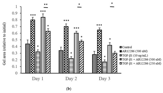 The contraction of floating collagen gels was considered to mimic the reorganization of the collagenous matrix during tissue development and healing. To evaluate the effect of AR12286 on TGF-β1-induced collagen gel contraction, we measured the area of the gels using freshly polymerized collagen matrices containing HConFs incubated with TGF-β1 in the absence or presence of AR12286 (Figure 6a). Gel-area ratio (relative to initial) was used to evaluate the contraction results. The control group exhibited a gradual reduction in gel-size ratio of 0.43 (Day 1), 0.35 (Day 2), and 0.25 (Day 3). The TGF-β1 treatment group displayed significantly more intense contractions than the control group did from Days 1 to 3 (p < 0.05). Results further demonstrated that the contraction induced by TGF-β1 could be inhibited by AR12286. The contraction in response to TGF-β1 was significantly counteracted by the presence of AR12286 in a dose-related manner (Figure 6b).
