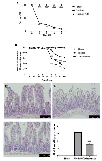 Effect of cashew nuts on ischemia/reperfusion (I/R) shock-induced mortality, mean arterial blood pressure, and intestine damage: survival % (A), mean arterial blood pressure (B), H&E staining: sham (C), vehicle (D), cashew nuts (E), histological injury score (F). Results were analyzed by the t-test. A p-value < 0.05 was considered significant. * p < 0.05 vs. sham, # p < 0.05 vs. vehicle, ** p < 0.01 vs. sham, ## p < 0.01 vs. vehicle, *** p < 0.001 vs. sham, ### p < 0.001 vs. vehicle.