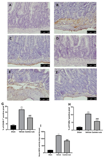 The intestinal expression of the adhesion molecules ICAM-1 and P-selectin was investigated. Immunohistochemical analysis revealed increased expression of both molecules in tissues harvested from vehicle-treated rats (Figure 2B,G,E,H, respectively) as compared to the sham tissues (Figure 2A,G,D,H, respectively). Cashew nuts administration was able to reduce both ICAM−1 (Figure 2C,G) and P-selectin (Figure 2F,H) expression in ileum tissues. Vehicle-treated rats also showed increased myeloperoxidase activity in inflamed ileum, which was reduced by cashew nuts treatment (Figure 2I).