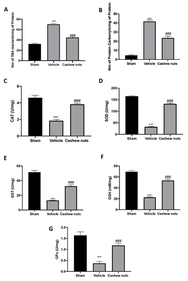 Vehicle-treated rats displayed a significant rise in the lipid peroxide (Figure 3A) and PCC (Figure 3B). Meanwhile, cashew nuts administration importantly restored the lipid peroxidation levels and PCC to the sham group levels (Figure 3A,B, respectively). I/R in vehicle-treated rats also decreased the antioxidant enzyme activities of CAT, SOD, GST, GPx, and GSH as compared to sham animals. Cashew nuts treatment restored the antioxidant status modified by I/R injury (Figure 3C–G, respectively).