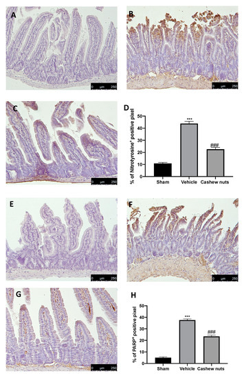 Tissue sections collected from vehicle-treated rats displayed positive staining for nitrotyrosine (Figure 4B,D) as compared to tissues from sham animals (Figure 4A,D). Moreover, a significant increase in PARP expression was detected in ileum tissue of vehicle-treated rats (Figure 5F,H) as compared to sham tissues (Figure 4E,H). Cashew nuts reduced nitrotyrosine and PARP expression in tissue collected from treated animals (Figure 4C,D,G,H, respectively).