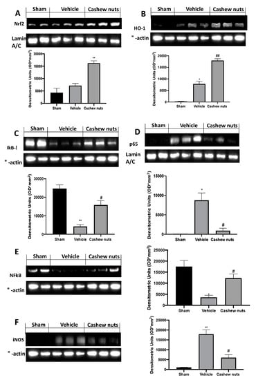 Western blot analysis of tissue sections collected from sham rats displayed basal Nrf2 expression, whereas in vehicle-treated rats, it was increased. Cashew nuts administration increased the expression of this transcription factor (Figure 5A). The same trend was observed for the HO−1 expression (Figure 5B): vehicle-treated rats showed increased HO-1 levels, as compared to the sham rats. Western blot analysis showed increased HO−1 in cashew nuts administered rats. We also evaluated the Ikb-α/NF-kB expression. I/R injury reduced Ikb-α (Figure 5C) and NF-kB expression in cytosol (Figure 5E), inducing increased NF-kB expression in the nucleus (Figure 5D). Cashew nuts restored Ikb-α expression in cytosol (Figure 5C) and reduced NF-kB levels into the nucleus (Figure 5D). Cashew nuts administration was able to reduce iNOS expression, which was upregulated in vehicle group as compared to tissues from sham animals (Figure 5E).