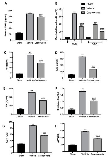 Effect of cashew nuts on intestinal barrier function, bacterial migration, and TNF-α (tumor necrosis factor alpha), Interleukin 6 (IL6), IL−1β, creatinine, glutamic oxaloacetic transaminase (AST), and alanine transaminase (ALT) levels induced by I/R shock: serum fluorescein isothiocyanate (FITC)-dextran (FD−40) levels (A), bacterial translocation (B), TNF-α (C), IL−1β (D), IL6 (E), creatinine (F), AST (G), and ALT levels (H). Results were analyzed by the t-test. A p-value < 0.05 was considered significant. * p < 0.05 vs. sham, # p < 0.05 vs. vehicle, ** p < 0.01 vs. sham, ## p < 0.01 vs. vehicle, *** p < 0.001 vs. sham, ###p < 0.001 vs. vehicle.