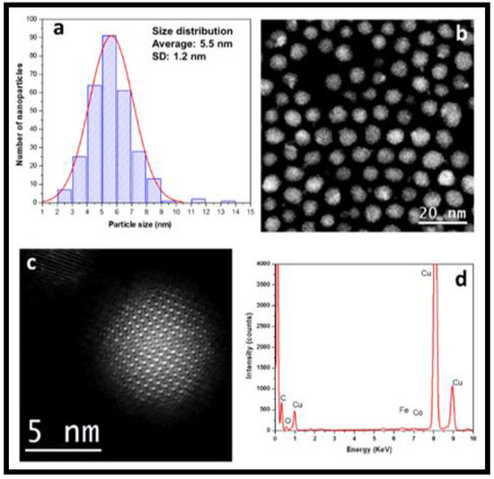 The spherical aberration-corrected (Cs-corrected) scanning transmission electron microscopy–high-angle annular dark-field imaging (STEM–HAADF) technique was used for CFNPS and the statistical studies were also performed on several NPs. Our analysis reveals a very narrow particle size range, between 2 and 10 nm, with an average of 5.5 ± 1.2 nm, as can be observed in Figure 2a. Figure 2b revealed a very good NP Gaussian distribution, homogeneous sizing, and spherical shapes, which demonstrate good control of the synthesis method. Remarkably, we confirmed the absence of smaller or larger NPs, which can be attributed to both control of the synthesis, and the reagent and precursors chosen for synthesis. The chemical composition of the NPs was performed by spherical aberration corrected (Cs-corrected) STEM imaging. As we can observe in Figure 2c, the CFNPs are formed with a spherical shape; the size of this NP corresponds to 5 nm approximately. The crystalline structure of this NP can be described as a multi-twinned NP due to the presence of atomic columns and defects in the nanostructure. The EDS spectrum (Figure 2d) was performed on the NP shown in Figure 2c, displaying the elemental presence of Co, Fe, and O corresponding to the NP, while C and Cu corresponds to the copper grid.