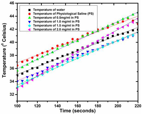 Hyperthermia is a treatment strategy that involves the exposure of magnetic nanoparticles to an alternating magnetic field to increase temperature and induce apoptosis in cells or tissues. In this work, microwaves were used to irradiate CFNPs with a microcoaxial double-slot antenna as an applicator, which was placed inside the tube containing the nanoparticles in physiological saline. In this case, 2.45 GHz was used as an Industrial, Scientific and Medical (ISM)-approved frequency for localized hyperthermia induction. Figure 5 depicts the temperature profiles in correspondence to the microwave irradiation time for water and different concentrations of cobalt ferrite nanoparticles in physiological saline. The microwave absorption rate of physiological saline (3.3 × 10−3) is higher compared to water (1 × 10−3) [52]. Upon the absorption of microwaves (2.45 GHz), the rotational motion of the electric dipole of water molecules gets excited and the average phase of this motion is delayed compared to the microwave electric field. The microwave energy leads to an increase in kinetic as well as intermolecular energies of water. The kinetic energy is responsible to increase the temperature of water, while the intermolecular energy leads to internal rearrangements in the water molecules. Physiological saline suspension (diluted salt solution) is heated drastically and rapidly compared to water since salt ions tend to heat up faster, specifically Cl− ions. The chloride ions in the presence of a microwave electric field tend to undergo motion and the microwave energy transfer leads to higher collision between salt ions and water molecules [53].