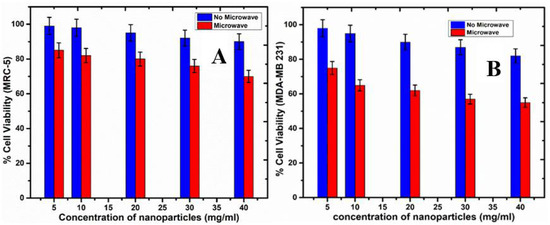 Thermal exposition of the cells through microwave irradiation of the CFNPs lead to higher cytotoxicity and mortality of cells compared to the absence of microwave irradiation. In the absence of microwaves, the inherent cytotoxicity of CFNPs was less in both types of cell lines, but as soon as the cells were exposed to microwave irradiation, the viability decreased tremendously. The microwave-exposed cells also showed increasing cell mortality with increasing concentrations of CFNPs. In the presence of alternating electromagnetic radiation, the magnetic nanoparticles lead to localized hyperthermia, thus causing the degradation of the cell organelles and the fragmentation of their DNA. In Figure 6, the cell viability results of both MRC-5 and MDA-MB-231 cell lines as a function of CFNP concentrations with and without microwave irradiation are shown. Our research group found a therapeutic window of CFNPs from 5 mg/mL to 40 mg/mL in which the cell viability of MDA-MB-231 decreases to 55% in contrast to the cell viability of MRC-5 cells, showing 70% on exposure to microwave irradiation at the same CFNP concentration of 40 mg/mL. Hyperthermia can be induced in cells above 43 °C. Hence, in this study, localized hyperthermia is induced in cells using microwave irradiation, maintaining the exposure time for 50 s. There is a relationship between the microwave power output and the temperature rise in the tube containing physiological saline with cells and nanoparticles. The power output was adjusted in such a way that the temperature was maintained at 50 °C for 50 s. This optimized power output was relevant to kill cells in the presence of nanoparticles with a lower exposure time. CFNPs absorb microwaves that induce hyperthermia in the cells, thus leading to their death. In the control cell studies, the cell viability of MRC-5 upon exposure to microwaves for 50 s, but without nanoparticles, was 98%, while that of MDA-MB-231 was 94%. Cancer cells are found to be more vulnerable upon exposure to microwaves compared to the normal ones. Furthermore, when both MDA-MB 231 (triple negative breast cancer cell lines) and MRC-5 (fibroblast normal cell lines) are exposed to the same increasing concentration of the CFNPs, cancer cells are found to have more mortality compared to the normal ones upon exposure to microwaves which can be corroborated from Figure 6. The reason for this vulnerability is still not known [55].