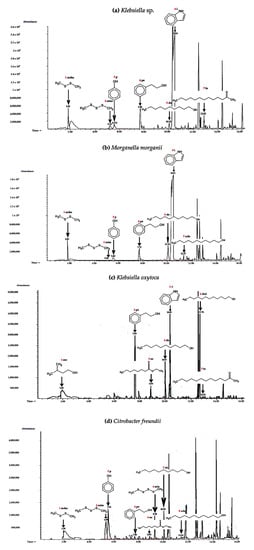 VOCsB recovered by SHS-SPME (Table 3), the total ion chromatogram representative of the four bacteria, are shown in Figure 1; the peaks are numbered relative to those indicated in Table 3. For both Klebsiella sp. and M. morganii bacterial strains isolated from C. lunulata, they were comprised of similar VOCsB derived from sulfur and large-chain alcohols, in addition to aromatic alcohols and indole, with the only difference that Klebsiella sp. emitted 2-tridecanone and M. morganii emitted 1-undecanol. For the bacterial strains isolated from C. barrerai, short-chain alcohol, aromatic alcohol, indole, and two fatty acid esters were recorded in K. oxytoca; this was the species that emitted the least number of VOCsB, in contrast to Ci. Freundii, where thirteen compounds were identified —three derived from sulfur, two large-chain alcohols, two aromatic alcohols, a carboxylic acid, and three fatty acid esters. Aromatic and sulfur-derived alcohols were identified in the compounds captured by DHS-SPE from C. lunulata, Klebsiella sp., and C. barrerai; however, the K. oxytoca strain was distinct, since only 2-phenyl ethanol was identified.