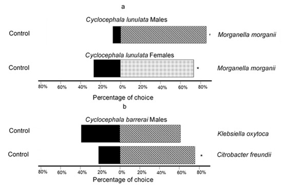 Attraction of Cyclocephala lunulata and Cyclocephala barrerai towards VOCsB from the bacteria resident of the genital chamber of females. Asterisks indicate significant differences in χ2 test and p > 0.05. (a) Males (n = 10) and females (n = 19) of C. lunulata attracted to VOCsB from Morganella morganii; (b) Males of C. barrerai (n = 18) attracted to VOCsB from Klebsiella oxytoca and Citrobacter freundii.