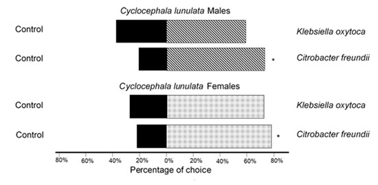 Attraction of females (n = 18) and males (n = 18) of Cyclocephala lunulata towards the VOCsB of the bacteria resident of the genital chamber of females of Cyclocephala barrerai. The asterisk indicates significant differences in χ2 test, and p > 0.05).