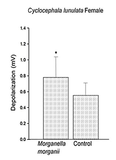 In the EAG bioassays, the antennae of female individuals of C. lunulata to the VOCsB of M. morganii (Figure 4) presented a statistically significant greater response to VOCsB than to the control (t = 2.80, n = 11, p = 0.01).