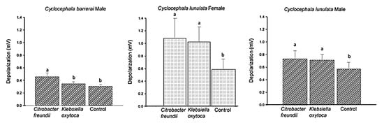 Antennal depolarization of Cyclocephala barrerai and Cyclocephala lunulata at VOCsB of Citrobacter freundii and Klebsiella oxytoca. Different letters indicate statistically different values by ANOVA Repeat Measures (RM) (Fisher Least significant difference (LSD), n = 12, p > 0.05).