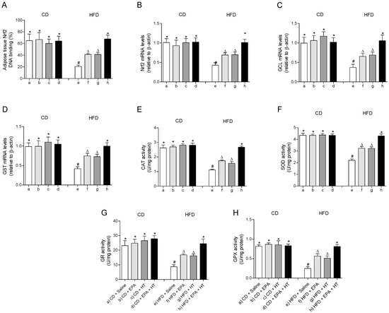 Nuclear factor E2-related factor 2 (Nrf2) DNA binding, (A) Nrf2 mRNA levels, (B) mRNA levels of glutamate-cysteine ligase (GCL) (C) and glutathione-S-transferase (GST), (D) and activity of catalase (CAT), (E) superoxide dismutase (SOD), (F) glutathione peroxidase (GPX), (G) and glutathione reductase (GR) (H) in epididymal white adipose tissue from mice subjected to control diet (CD) and high-fat diet (HFD) supplemented or not with eicosapentaenoic acid (EPA), hydroxytyrosol (HT) or EPA + HT. Values are expressed as mean ± SD. Eight to ten mice were included in each experimental group. Groups that do not share the same superscript symbol were significantly different among them, namely, (a), CD + saline; (b) CD + EPA; (c) CD + HT; (d) CD + EPA + HT; (e), HFD + saline; (f) HFD + EPA, (g) HFD + HT; and (h), HFD + EPA + HT, according to two-way analysis of variance (ANOVA) followed by the Tukey’s post-test, p < 0.05. (*), does not differ from (a) group; (#), differ from (a) group and does not differ from (e) group; (∆), differ from (a) and (b) groups.