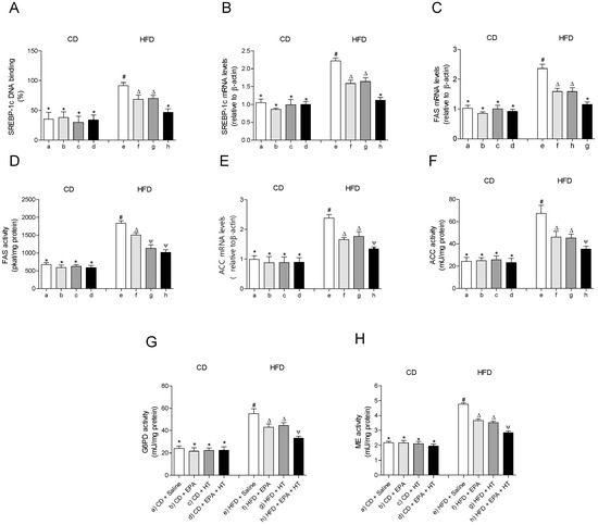 Sterol regulatory element-binding protein-1c (SREBP-1c) DNA-binding, (A) SREBP-1 mRNA levels, (B) fatty acid synthase (FAS) mRNA content, (C) FAS activity, (D) acetyl-CoA carboxylase (ACC) mRNA levels, (E) ACC activity, (F) glucose-6-phosphate dehydrogenase (G6PD) activity, (G) and malic enzyme (ME) activity (H) in epididymal white adipose tissue from mice subjected to control diet (CD) and high-fat diet (HFD) supplemented or not with eicosapentaenoic acid (EPA), hydroxytyrosol (HT) or EPA + HT. Values are expressed as mean ± SD. Eight to ten mice were included in each experimental group. Groups that do not share the same superscript symbol were significantly different among them, namely, (a), CD + saline; (b) CD + EPA; (c) CD + HT; (d) CD + EPA + HT; (e), HFD + saline; (f) HFD + EPA, (g) HFD + HT; and (h), HFD + EPA + HT, according to two-way analysis of variance (ANOVA) followed by the Tukey’s post-test, p < 0.05. (*), does not differ from (a) group; (#), differ from (a) group; (∆), differ from (a) and (e) groups; (Ψ), differs from groups (a), (e) and those marked with the symbol ∆.