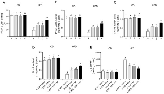 Peroxisome proliferator-activated receptor-gamma (PPAR-γ) DNA-binding, (A) mRNA levels of PPAR-γ, (B) fatty acid transport protein 1 (FATP1), (C) lipoprotein lipase (LPL) (D) and LPL activity (E) in epididymal white adipose tissue from mice subjected to control diet (CD) and high-fat diet (HFD) supplemented or not with eicosapentaenoic acid (EPA), hydroxytyrosol (HT) or EPA + HT. Values are expressed as mean ± SD. Eight to ten mice were included in each experimental group. Groups that do not share the same superscript symbol were significantly different among them, namely, (a), CD + saline; (b) CD + EPA; (c) CD + HT; (d) CD + EPA + HT; (e), HFD + saline; (f) HFD + EPA, (g) HFD + HT; and (h), HFD + EPA + HT, according to two-way analysis of variance (ANOVA) followed by the Tukey’s post-test, p < 0.05. (*), does not differ from (a) group; (#), differ from (a) group; (∆), differ from (a) and (e) groups; (Ψ), differs from groups (a), (e) and those marked with the symbol ∆.