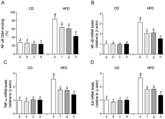 Nuclear factor erythroid 2–related factor 2 (NF-κB) DNA-binding, (A) mRNA levels of NF-κB, (B) mRNA levels of tumor necrosis factor (TNF-α), (C) and mRNA levels of interleukin 6 (IL-6) (D) in epididymal white adipose tissue from mice subjected to control diet (CD) and high-fat diet (HFD) supplemented or not with eicosapentaenoic acid (EPA), hydroxytyrosol (HT) or EPA + HT. Groups that do not share the same superscript symbol were significantly different among them, namely, (a), CD + saline; (b) CD + EPA; (c) CD + HT; (d) CD + EPA + HT; (e), HFD + saline; (f) HFD + EPA, (g) HFD + HT; and (h), HFD + EPA + HT, according to two-way analysis of variance (ANOVA) followed by the Tukey’s post-test, p < 0.05. (*), does not differ from (a) group; (#), differ from (a) group; (∆), differ from (a) and (e) groups; (Ψ), differs from groups (a), (e) and those marked with the symbol ∆.