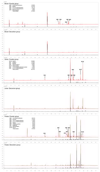 Total ion chromatograms (TICs) of compounds identified in blood, urine, and feces of rats after oral administration of ARR powder or decoction by HS–SPME–GC–MS. Contents were calculated from extracted ion chromatography (EIC) according to area generalization method. Red line: treatment group; black line: control group.
