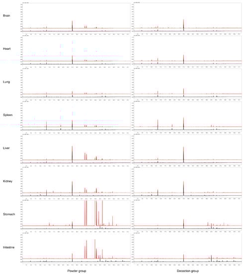 Total ion chromatograms (TICs) of compounds identified in brain, heart, lung, spleen, liver, kidney, stomach, and small intestine of rats after oral administration of ARR powder or decoction by HS–SPME–GC–MS. Red line: treatment group; black line: control group.