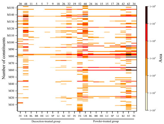Similarly, 74 VOCs (43/6/25) were detected in the decoction-treated group. There were 48 (26/5/17) VOCs in urine, 32 (28/0/4) in stomach, 26 (22/1/3) in kidney, 20 (19/0/1) in feces, 19 (17/0/2) in small intestine, 18 (15/1/2) in liver, 11 in (11/0/0) blood, 9 (9/0/0) in spleen, 7 (6/0/1) in lung, 5 (5/0/0) in brain, and 5 (5/0/0) in heart.