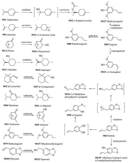 M64 (safrole) was oxidized to form M141 (3,4-methylenedioxypheny-1-propanal) and M149 (1-hydroxy-2-(prop-2-enyl)-4,5-methylenedioxybenzene), and M96 (m-eugenol) was formed after the breaks and methylation of methylenedioxybenzene [17,18,19]. M11 (terpinolene) was transformed into M42 (α-terpineol acetate) after oxidation and esterification.