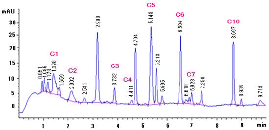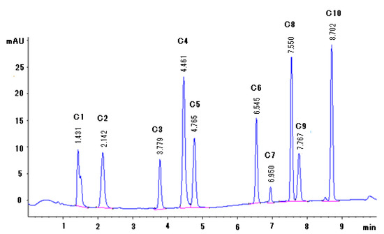 Chromatogram representing the separation of Compounds 1–10 using an XTerra® MS C18 column (150 × 4.6 mm, 3.5 µm) under the conditions described in Section 3.3.
