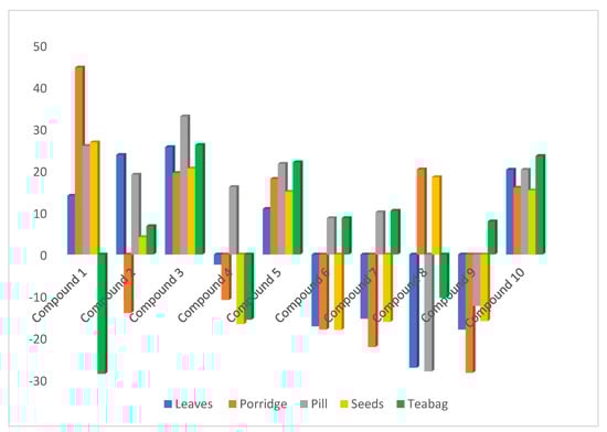 Linearity of the method was determined using the external standard calibration and matrix-match calibration methods. The calibration curves were obtained by plotting the average peak area vs. the concentration of the compounds. The calibration curves for all the compounds in the solvent and five different matrices showed a good linear relationship between peak area and concentration in the range of 1–10 mg L−1 and 3–10 mg kg−1, respectively. This is shown by the regression coefficients (r2) of the compounds, that were in the range 0.9942–0.9999 and 0.9900–0.9998 in the solvent and matrices respectively, which confirms good linearity (Table 1). The percentage matrix effect for each compound in the different matrices were calculated using Equation (1) given in Section 3.4. As shown in Figure 3, the compounds experience either a positive or negative matrix effect. A negative matrix effect means that the detector response for the compound was decreased/suppressed, while a positive matrix effect means that the detector response was increased/enhanced [17]. The % matrix effect (ME) for the compounds in the different matrices ranged from −29% to 45%, with compound 1 experiencing the highest suppression in the teabags and the highest enhancement in the porridge sample as compared to the other compounds. Compounds 3, 5, and 10 were enhanced in all the products shown by the positive matrix effect. Overall, 60% of the compounds were enhanced and 40% were suppressed in the different products, as shown by the positive and negative matrix effects, respectively. Matrix effect is classified as mild, medium, or strong when % ME is <±20%, ≥±20% but <±50% and ≥±50%, respectively. In the leaves, porridge, and teabags matrices, 60% of the compounds experienced mild matrix effect while 40% experienced medium matrix effect (see Supplementary Figure S1). With regards to the seeds, 80% and 20% of the compounds experienced mild and medium matrix effect, respectively (Supplementary Figure S1). On the other hand, for the pill matrix, there was equal distribution of mild and medium matrix effects (Supplementary Figure S1). Strong matrix effect was not observed for any compound in all the products. This means that the matrix effect experienced by the compounds in the different products is not significant and hence calibration equations in the solvent can be used for quantification. However, matrix-matched calibration equations were used to give more accurate results.