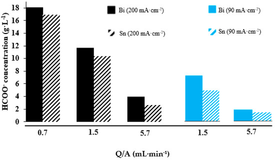 A summary of the results in terms of HCOO− concentration obtained at different current densities and catholyte flows is represented in Figure 2. On the one hand, operating at a certain same current density (90 or 200 mA·cm−2), a higher HCOO− concentration collected in the output stream of the electrochemical filter press cell is obtained if the catholyte flow is lowered from 5.7 to 0.7 mL·min−1·cm−2. As happened with the FE and the HCOO− rate, the performance of the electrochemical cell in terms of HCOO− concentration is better working with Bi/C-GDEs than with Sn/C-GDEs. The highest HCOO− concentration obtained was 18.0 g·L−1, which was 7% higher than operating with the same value of current density and catholyte flow in Sn/C-GDEs (Figure 2). However, working with a current density = 200 mA·cm−2, the highest difference between the Bi/C-GDEs and the Sn/C-GDEs was operating with a catholyte flow = 5.7 mL·min−1, obtaining an HCOO− concentration of 3.95 g·L−1 (using Bi/C-GDE as cathode), which was 50% higher with respect to the value of HCOO− concentration using Sn/C-GDE.