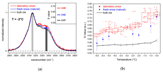 Figure 3b. For ice, the S value is almost constant, with a slight increase around −1 °C. Natural snow has a higher S value than ice. The trend increases with increasing temperature and is steeper when approaching the solid–liquid phase transition temperature (T > −1 °C). The S value of laboratory snow is the highest among the three samples and it is clearly distinguishable from that measured for natural snow down to −1 °C. The trend of the S value is linear between −5.5 °C and −4.5 °C, then decreases slightly at −4 °C and rapidly increases around −1.5 °C. Thereafter, it remains almost constant up to −0.5 °C.