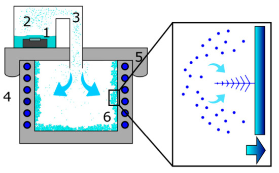 Figure 4 we display a schematic of our home-made device for laboratory snow production. The ultrasonic nebulizer (1) produces a stream of small water droplets (3) that flows inside the freezer. The snow crystals nucleate and grow on the metallic walls of the freezer (6). We used a 200 W commercial freezer with an internal surface of stainless-steel plates which remove the heat from the environment. We sealed the top opening of the freezer with a 2 cm thick Styrofoam plate on which we made a circular hole (diameter 5 cm). We adapted a polyethylene tube to the circular hole to connect the freezer with a water supply (2).
