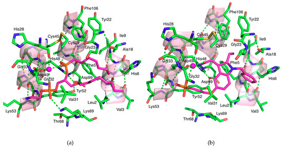 Early attempts at the development of effective inhibitors of sPLA2 started from the synthesis of the analogues of the phospholipid substrates. The first hGIIA crystal structure with a ligand to be deposited in the PDB (PDB ID 1POE, 2.1 Å resolution) including a transition state analogue (TSA) inhibitor called L-1-O-octyl-2-heptylphosphonyl-sn-glycero-3-phosphoethanolamine which was designed to be a mimic of the tetrahedral intermediate formed during the hydrolysis of L-1,2-dioctanoyl-sn-3-phosphatidylethanolamine, and has a phosphonate replacing the sn-2 ester [156]. The compound arose from studies surveying short chain substrates and inhibitors on a number of PLA2s [157], although not hGIIA. The TSA interacts closely with the primary calcium with the oxygens of two phosphates providing ligating atoms (see Figure 6a). A structure of the same TSA was reported prior to the description of the hGIIA complex with the GIIA from Chinese cobra (Naja naja atra) venom (PDB ID 1POB, 2.0 Å resolution) [158]. The positioning of the polar head groups is effectively the same as in the hGIIA with the two hydrophobic chains occupying the same space in both structures with some conformational differences, more especially identifiable at the start of the sn-1 chain. As also found in the hGIIA-TSA complex, there is less confidence in the positions of the carbons in the hydrophobic chains towards their termini.