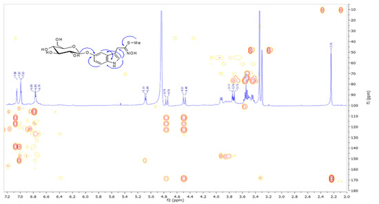 The protons were assigned to the corresponding carbons by an HSQC experiment (Table 1). The COSY spectrum indicated the presence of a hexose unit, which on the basis of the 1H and 13C chemical shifts and coupling constants of anomeric proton was identified as β-O-glucopyranoside [16]. The aromatic portion was identified as indolic unit on the basis of 1H and 13C chemical shifts and long-range heterocorrelations observed in the HMBC spectrum (Figure 2). The most important correlations observed for the indole were: the protons at δ 7.10 and 7.02 attributed to the H-2, H-4, and H-7 respectively with the C-8 carbon at δ 140.5, and the first proton was also correlated to the sp3 carbon at δ 39.0 (C-1), C-3 (δ 113.5), and C-9 (δ 119.0) carbons; the H-7 proton was also correlated to the C-5 (δ 153.5), carbon as well as the H-6 proton (δ 6.80) gave cross peaks with the C-4, C-7 (δ 123.9) and C-8 carbons. In the HMBC spectrum heterocorrelation of the anomeric proton at δ 5.10 with the C-5 carbon was observed indicating that the compound was glucosylated on indole. Beside the already reported correlations, the H-1 and methyl protons were correlated to the C-0 (δ 171.0) defining a methyl N-hydroxyimidothioate group. NOESY spectrum evidenced correlation between the anomeric proton (δ 5.10) and aromatic proton at δ6.80 and H-5′ (δ 3.61). All these data led to the structure of methyl N-hydroxy-2-(5′-O-β-d-glucopyranosyl)-1H-indol-3-yl)ethanimidothioate (1) named cleomside A.