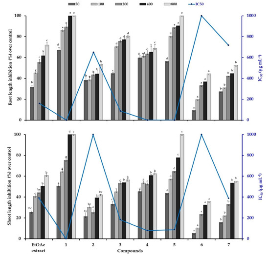 Similarly, the compounds 1 and 5 exerted the highest phytotoxic effect on lettuce growth indicated by a total inhibition from 400 and 800 µg mL−1, respectively (Figure 3). In all cases, the root length was more sensitive than shoot, particularly in the presence of EtOAc extract, the compounds 3 and 4 in which they revealed an average inhibition of 73.6% and 59.7% for root and shoot lengths, respectively, at the highest concentration. While, the other compounds exhibited moderate inhibition of 47.2% on lettuce seedling growth. Thus, the highest phytotoxic effect of the active compounds was displayed by the lowest IC50 values, which was estimated under 50 µg mL−1 in the presence of the compound 1 for root and shoot lengths. Similarly, the compounds 4 and 5 possess the lowest IC50 values (under 50 µg mL−1) for root lengths and was about 83.8 µg mL−1 for shoot lengths. The EtOAc extract and the compound 7 revealed IC50 value of 389 µg mL−1, while the compound 3 possess a value of 183 µg mL−1. However, the highest IC50 value was estimated about more than 800 µg mL−1 by the compounds 6 and 2 (Figure 3).
