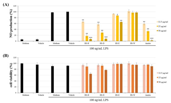 Effects of different partition fractions (HS-H, HS-D, HS-E and HS-W represent n-hexane, dichloromethane, ethyl acetate and H2O fractions, respectively) of crude MeOH extracts from Hypericum sampsonii on (A) nitric oxide (NO) production and (B) cytotoxicity in lipopolysaccharide (LPS)-induced RAW264.7 macrophages. Data expressed as means ± SEM (n = 3). Asterisks indicate significant differences (* p < 0.05, ** p < 0.01 and *** p < 0.001) from the (media + DMSO + LPS) control group.
