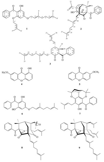 The known isolates were readily identified by a comparison of physical and spectroscopic data (UV, IR, 1H-NMR, [α]D and MS) with corresponding authentic samples or literature values, and this included two xanthones, 1-hydroxy-7-methoxyxanthone (4) [26] and 2-methoxyxanthone (5) [27], two benzophenones, 2,4,6-trihydroxybenzophenone-4-O-geranyl ether (6) [23] and sampsonin B (7) [7], two benzoylphloroglucinol derivatives, sampsonione J (8) [18] and otogirinin A (9) [28].