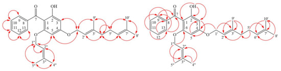 Compound 1 was isolated as yellowish oil. Its molecular formula, C28H34O4, was determined on the basis of the negative HR–ESI–MS ion at m/z 433.2370 [M − H]− (calcd 433.2379) and supported by the 1H- and 13C-NMR data. The presence of conjugated carbonyl group was revealed by the band at 1618 cm−1 in the IR spectrum and was confirmed by signal at δ 199.6 in the 13C-NMR spectrum. The 1H- and 13C-NMR data of 1 showed the presence of a benzoyl group [δH 7.35 (2H, br t, J = 7.5 Hz, H-10 and H-12), 7.43 (1H, br t, J = 7.5 Hz, H-11) and 7.48 (2H, br d, J = 7.5 Hz, H-9 and H-13); δC 127.4 (C-9), 127.4 (C-13), 127.5 (C-10), 127.5 (C-12), 130.2 (C-11) and 142.3 (C-8)], a hydroxyl group [δH 12.37(1H, s, D2O exchangeable, OH-2)], a geranyloxy group [δH 1.62, 1.69 and 1.76 (each 3H, each s, H-10ʹ, H-8ʹ and H-9ʹ), 2.11 (2H, br t, J = 6.5 Hz, H-4ʹ), 2.14 (2H, m, H-5ʹ), 4.58 (2H, d, J = 6.5 Hz, H-1ʹ), 5.10 (1H, br t, J = 6.5 Hz, H-6ʹ) and 5.48 (1H, br t, J = 6.5 Hz, H-2ʹ); δC 16.7 (C-9ʹ), 17.7 (C-10ʹ), 25.7 (C-8ʹ), 26.3 (C-5ʹ), 39.5 (C-4ʹ), 65.2 (C-1ʹ), 118.4 (C-2ʹ), 123.6 (C-6ʹ), 131.9 (C-7ʹ) and 142.3 (C-3ʹ)], an isoprenyloxy group [δH 1.50 and 1.57 (each 3H, each s, H-5ʹʹ and H-4ʹʹ), 4.18 (2H, d, J = 6.0 Hz, H-1ʹʹ) and 4.62 (1H, br t, J = 6.0 Hz, H-2ʹʹ); δC 18.0 (C-5ʹʹ), 25.5 (C-4ʹʹ), 65.1 (C-1ʹʹ), 118.4 (C-2ʹʹ) and 137.0 (C-3ʹʹ)] and two meta-coupling aromatic protons [δH 5.93 and 6.16 (each 1H, each d, J = 2.5 Hz, H-5 and H-3); δC 92.5 (C-5) and 94.1 (C-3)]. The signal at δH 12.37 exhibited a chelated hydroxyl group with the carbonyl group. These indicated there is a typical benzophenone structure in Compound 1 [15]. Comparison of the 1H- and 13C-NMR data of 1 with those of 4-geranyloxy-2,6-dihydroxybenzophenone [23] suggested that their structures were closely related, except that the 6-isoprenyloxy group of 1 replaced the 6-hydroxy group of 4-geranyloxy-2,6-dihydroxybenzophenone [23]. This was supported by both HMBC correlations between H-1ʹʹ (δH 4.18) and C-6 (δC 161.4), C-2ʹʹ (δC 118.4) and C-3ʹʹ (δC 137.0) and NOESY correlations between H-1ʹʹ (δH 4.18) and H-5 (δH 5.93). This was supported by 1H–1H COSY, HSQC, NOESY (Figure 3) and HMBC (Figure 3) experiments. On the basis of the above data, the structure of 1 was elucidated as 4-geranyloxy-2-hydroxy-6-isoprenyloxy- benzophenone.