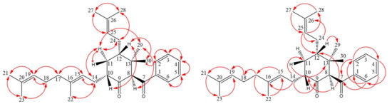 Compound 3 was isolated as colorless oil, [α = + 326.4 (c 0.15, CHCl3). Its molecular formula, C30H42O2, was determined on the basis of the positive HR–ESI–MS (m/z 457.3086 [M + Na]+, calcd 457.3083) and supported by the 1H- and 13C-NMR data. The IR spectrum displayed the presence of carbonyl groups (1707 and 1672 cm−1), which was confirmed by the signals at δ 196.7 and 208.4 in the 13C-NMR spectrum. The 1H- and 13C-NMR data of 3 showed the presence of a benzoyl group [δH 7.45 (2H, br t, J = 7.5 Hz, H-3 and H-5), 7.55 (1H, br t, J = 7.5 Hz, H-4) and 7.99 (2H, br d, J = 7.5 Hz, H-2 and H-6); δC 128.6 (C-3), 128.6 (C-5), 128.7 (C-2), 128.7 (C-6), 133.2 (C-4) and 138.5 (C-1)], a geranyl group [δH 1.58, 1.59 and 1.66 (each 3H, each s, H-22, H-23 and H-21), 1.95 (2H, m, H-17), 1.98 (1H, m, H-14), 2.02 (2H, m, H-18), 2.32 (1H, m, H-14), 5.05 (1H, br t, J = 7.6 Hz, H-15) and 5.07 (1H, br t, J = 6.8 Hz, H-19); δC 16.2 (C-22), 17.7 (C-23), 25.7 (C-21), 26.8 (C-18), 27.4 (C-14), 39.8 (C-17), 121.6 (C-15), 124.3 (C-19), 131.3 (C-20) and 136.7 (C-16)], an isoprenyl group [δH 1.60 (3H, s, H-28), 1.67 (1H, m, H-24), 1.73 (3H, s, H-27), 2.15 (1H, m, H-24) and 5.21 (1H, br t, J = 7.4 Hz, H-25); δC 17.8 (C-28), 25.8 (C-27), 28.1 (C-24), 123.6 (C-25) and 132.4 (C-26)], two methyl groups [δH 0.91, 0.99 (each 3H, each s, H-29 and H-30); δC 22.1 (C-29) and 26.1 (C-30)] and a cyclohexanone core structure [δH 1.14 (1H, m, Hα-11), 2.20 (1H, m, Hβ-11), 2.64 (1H, m, H-12), 2.88 (1H, m, H-10), 4.35 (1H, s, H-8); δC 34.5 (C-11), 40.3 (C-12), 43.3 (C-13), 47.6 (C-10), 72.1 (C-8) and 208.4 (C-9)]. Comparison of the 1H- and 13C-NMR data of 3 with those of norsampsone B [25] suggested that their structures were closely related, except that the 10-geranyl group and H-10 of 3 replaced the isoprenyl and 5-methylhex-4-enoyl groups at C-10 of norsampsone B [25]. This was supported by both HMBC correlations between H-14 (δH 1.98 and 2.32) and C-9 (δC 208.4), C-10 (δC 47.6) and C-11 (δC 34.5) and ROESY correlations between H-14 (δH 1.98 and 2.32) and H-10 (δH 2.88). The relative stereochemistry of 3 was elucidated on the basis of ROESY experiments (Figure 6). The ROESY cross-peaks between H-8/H-29, H-10/H-12, Hα-11/H-14, Hα-11/H-24, Hα-11/H-29, H-12/H-30 and H-2/H-30 suggested that H-10, H-12, Me(30) and the bond between C-7 and C-8 is on the β-side and Me(29), H-8, the geranyl group at C-10 and the isoprenyl group at C-12 are on the α-side of 3. A computer-assisted 3D structure was obtained by using the molecular modeling program CS CHEM 3D Ultra 12.0, with MM2 force-field calculations for energy minimization. The calculated distances between H-8/H-29 (2.768 Å), H-10/H-12 (2.507 Å), Hα-11/H-14 (2.542 Å), Hα-11/H-24 (3.247 Å), Hα-11/H-29 (2.231 Å), H-12/H-30 (2.509 Å) and H-2/H-30 (3.631 Å) are all less than 4 Å (Figure 6); this is consistent with the well-defined ROESY observed for each of the proton pairs. Thus, the structure of 3 was elucidated as shown in Figure 2 and named hypericumone B. This was further confirmed by the 1H–1H COSY, ROESY, HSQC and HMBC experiments (Figure 7).