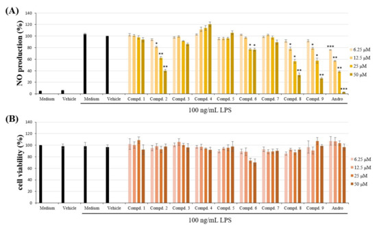 Effects of Compound 1–9 from Hypericum sampsonii on (A) NO production and (B) cytotoxicity in LPS-induced RAW264.7 macrophages. Data expressed as means ± SEM (n = 3). Asterisks indicate significant differences (* p < 0.05, ** p < 0.01 and *** p < 0.001) from the (media + DMSO + LPS) control group.