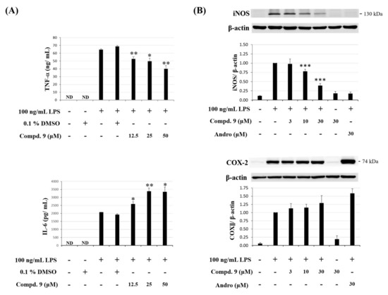 Tumor necrosis factor-α (TNF-α), interleukin-6 (IL-6), inducible nitric oxide synthase (iNOS) and cyclooxygenase-2 (COX-2) are pivotal proinflammatory mediators during the inflammatory process [30]. We further investigated whether otogirinin A (9) was able to reduce these proinflammatory molecules induced by LPS. The results showed that otogirinin A (9) suppressed LPS-induced TNF-α generation but did not exhibit significant inhibitory activity against IL-6 production (Figure 9A). In addition, the expression level of iNOS was reduced by treatment with otogirinin A (9); however, there was no significant difference of COX-2 by treatment with otogirinin A (9) (Figure 9B). Therefore, otogirinin A (9) exhibited the anti-inflammatory activity by reducing iNOS protein expression instead of COX-2.