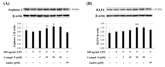 M2-polarized macrophages are important on tissue repair [31]. Arginase 1 is an important M2 marker that connects Krüppel-like factor 4 (KLF4) to the biologic processes involved in M2 polarization [32]. High level of arginase-1 can compete with iNOS for arginine and reduce NO production [33]. In addition, KLF4, which is one of the major members of the KLF family, was shown to induce M2 macrophage phenotype, whereas it reduced M1 macrophage expression [34]. We further examined whether otogirinin A (9) enhanced the expression level of M2 macrophages. The result showed that expression levels of arginase-1 and KLF4 were both induced by treatment with otogirinin A (9) with a concentration-dependent manner (Figure 10A,B). These results suggested that otogirinin A (9) promoted macrophage M2 markers, arginase-1 and KLF4, which exhibited the anti-inflammatory activity.