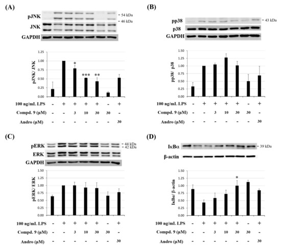 Mitogen-activated protein kinases (MAPKs) are crucial transcription factors for anti-inflammatory therapeutics because their activation and involvement in regulation of the synthesis of inflammation mediators at transcriptional and translational levels [35]. To investigate the MAPK pathway, we examined whether otogirinin A (9) effected on LPS-induced phosphorylation of extracellular signal-regulated kinase (ERK), c-JUN N-terminal kinase (JNK) and p38 MAPKs by Western blot analysis. The result showed that the expression levels of pJNK were dramatically reduced by treatment with otogirinin A (9) (Figure 11A). However, no significant difference of pp38 and pERK was observed when treated with otogirinin A (9) (Figure 11B,C). Therefore, otogirinin A (9) suppressed MAPK/JNK signaling pathway by reducing the phosphorylation of JNK instead of p38 and ERK.