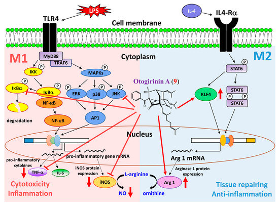 Schematic diagram for anti-inflammatory action of otogirinin A (9) in LPS-induced RAW264.7 macrophages.